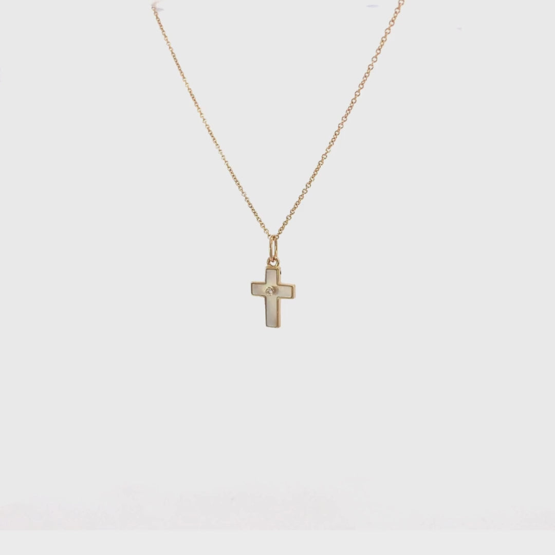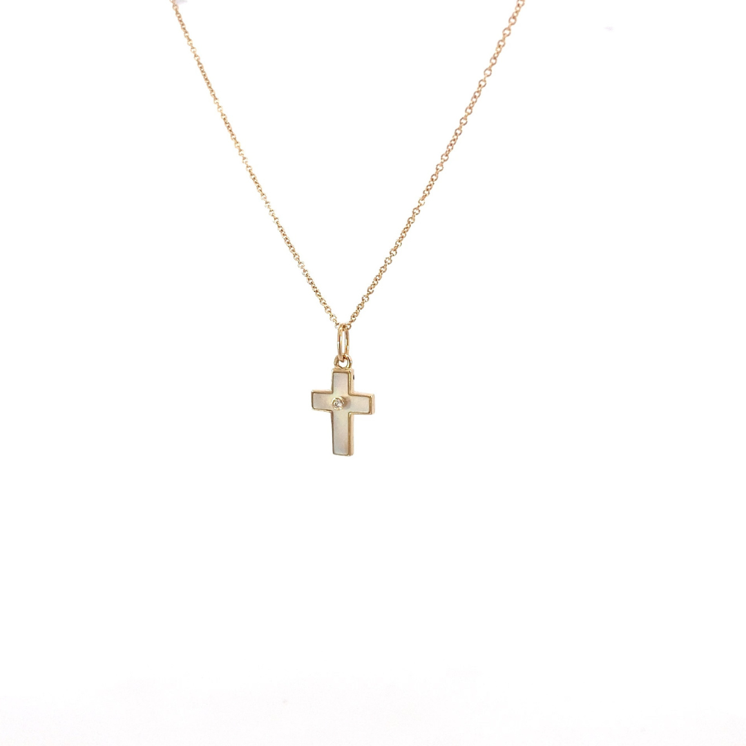 Cruz pequeña de oro 14 K con madre perla y circonia al centro