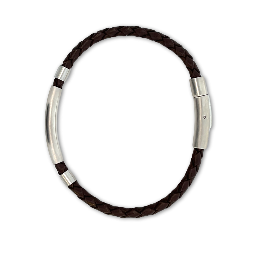 La pulsera “de Cuero con Barra” destaca por su diseño sencillo y sofisticado. Elaborada en cuero café de alta calidad, incorpora una barra metálica pulida que añade un toque moderno y elegante.